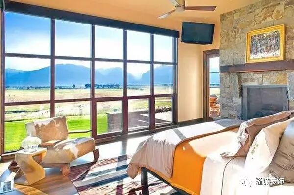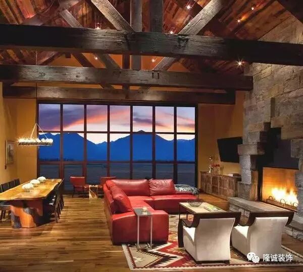 1.客厅里的壁炉是用石头堆砌的,看起来像一堵有强烈历史感的墙。民族风格的地毯与整体风格非常相配。