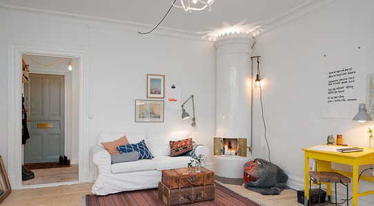 北欧风格的36栋小户型住宅设计 设计重点:墙壁扩展和存储 编者按:门廊的墙面通过挂钩和开放式挂柜扩大了储物空间,便于主人进出时放置物品。从门廊看整个公寓,前面是客厅和卧室,左边是厨房空间,左边是独立卫生间,功能分区清晰合理。36套北欧风格的公寓和小型公寓的设计 设计焦点:开放式布局 编者按:客厅采用开放式布局,只有古董地毯来画休息区,亮黄色的桌子成为一个小工作区。白色织物沙发融入背景,使视觉空间更加开阔。