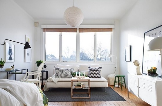 被编辑,客厅和卧室将合并成一个空间。通过点缀在墙上的纯白色、黑色边缘和清新的绿色,整个空间将看起来艺术、现代和清新。
