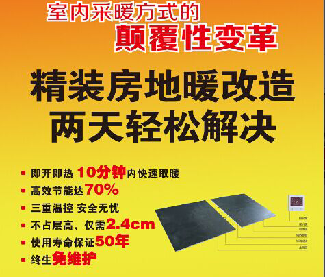 电热地暖将保护层、电热膜、保温层和温控系统完全集成到一个单元加热板中,单元加热板自由拼接成任何面积和形状的加热区域。这种电热地暖不仅可以快速解决新房子的地暖装修,而且可以轻松解决旧房的地暖装修。