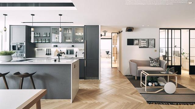 开放式厨房由深灰色系统橱柜和中间的白色石英石台面岛组成,展现出简洁而锐利的视觉元素。冰箱和烤箱隐藏在橱柜中,可以避免大型家用电器出现在空间中而显得不合适。交错深度的人字拼花地板与室内场所串联,给人以简约清新的空间和交织优雅的风格的立体感觉。