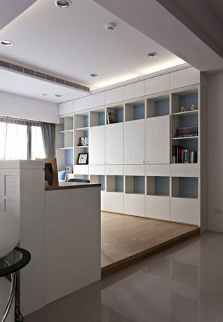 开放式学习与和谐室的联合规划,具有亲子互动和休息的功能,也是良好的阅读环境;书柜的中间部分还可以预留空间放电视和电脑,这样书房也可以作为娱乐室。